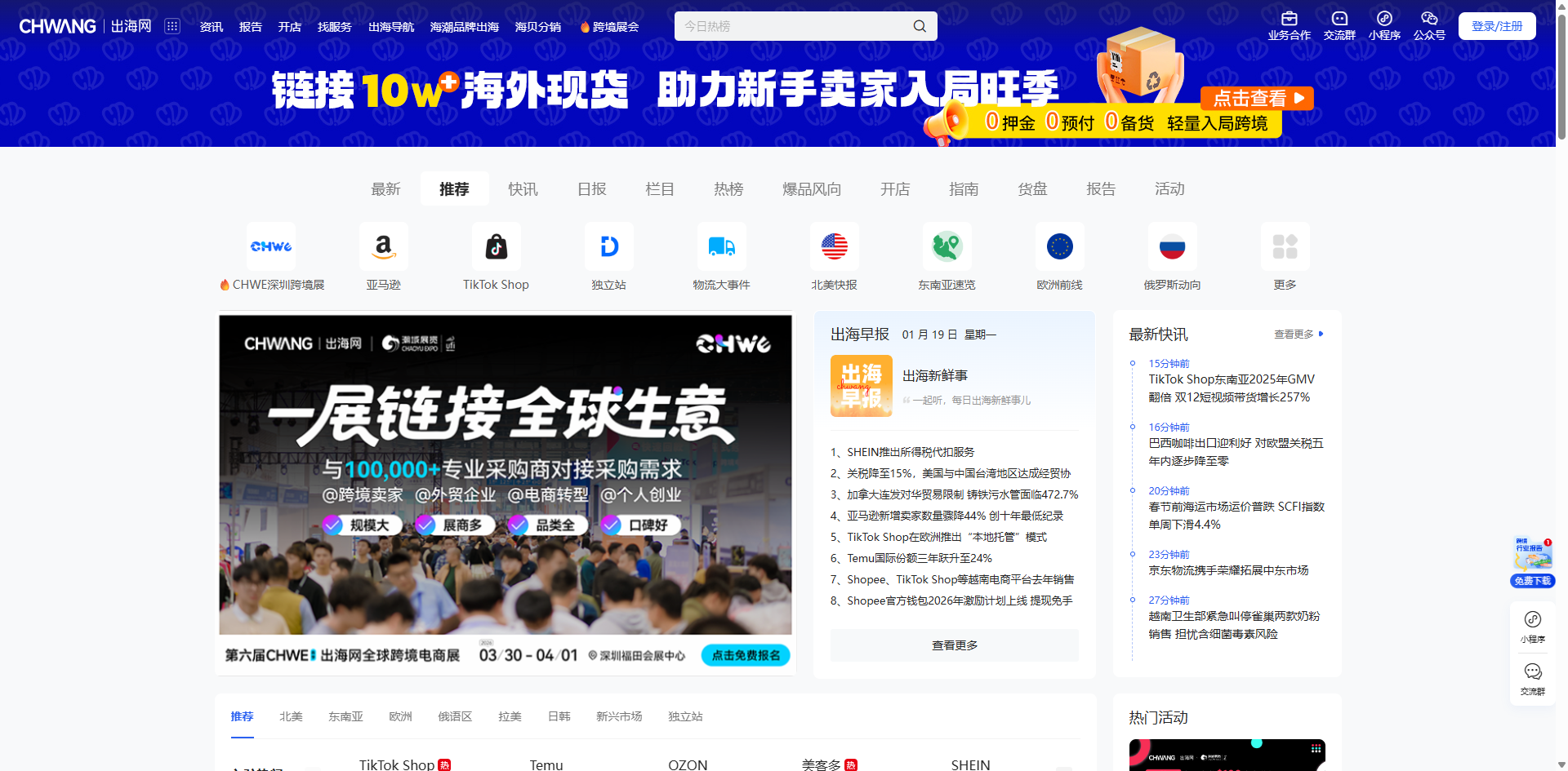 出海网是领先的企业跨境出海综合服务平台,旗下涵盖CHWE全球跨境电商展、海潮品牌出海及海贝分销三大主营产品。其中CHWE作为中国跨境电商贸易第一展,展会规模最大,单一场次超10万平,累计链接2万多源头工厂。出海网还提供出海快讯、新手指南、出海报告、全球开店、海外本土服务及出海社群等六大内容级服务。出海网让中国企业出海更容易!